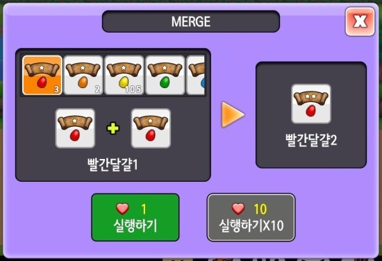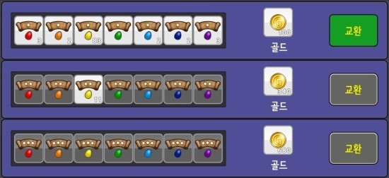 그런데, 같은 단계의 달걀 2개는 상위단계의 달걀로 교환 (하트가 필요합니다)할 수 있고, 상위단계의 7색을 모으면 좀 더 많은 보상을 얻을 수가 있습니다.